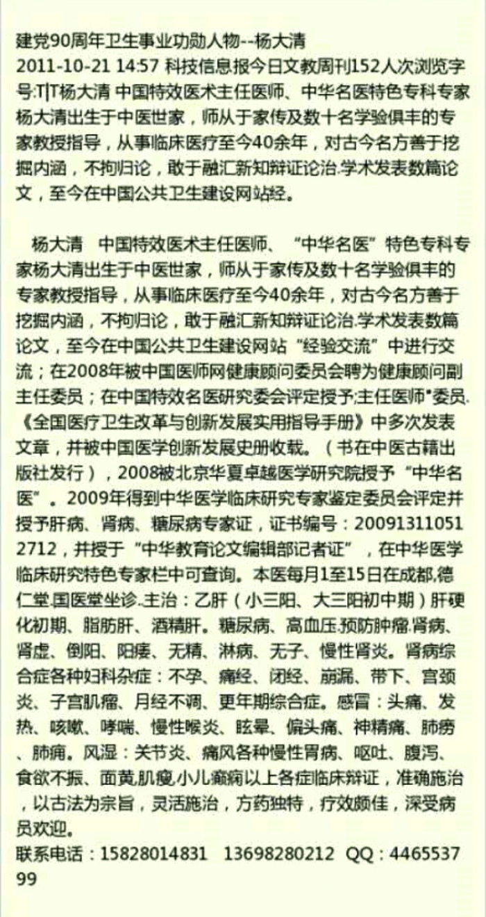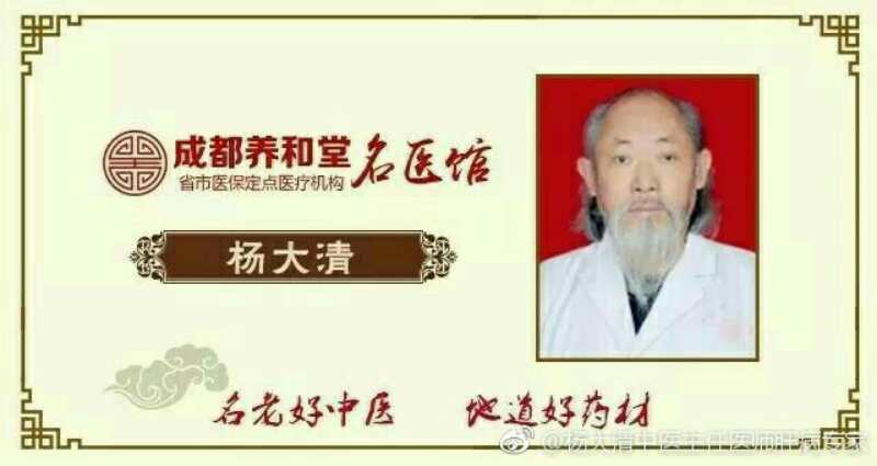 杨大清是中华名医,中医主任医师,出生于中医世,肝病,肾病,糖尿病,妇科专家,68年从实中医临床工作五十年,现常住成都市,的北京同仁堂,同康名医,泰山堂中医院,海王星出,北京同仁堂坐三个店,共在成坐六店能流出诊,在成都114预约挂号,诊费50元,