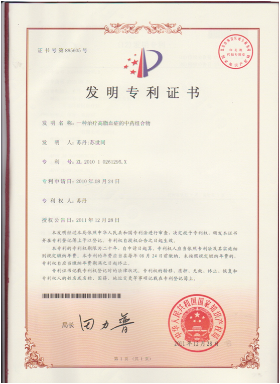 于2010年8月24日向国家专利局申报:“一种治疗高脂血症的中药组合物”国家发明专利,经国家专利局严格审察通过,并下达了《发明专利受理通知书》,专利号:201010261295X,于2010年12月8日在国家知识产权局《发明专利公报》上公开,2011年8月30日已正式授权并下达《授权通知书》,又于2011年12月28日国家知识产权局正式颁发国家《发明专利证书》。一些专利网站和报社已宣传报导。“一种治疗高脂血症的中药组合物”即本发明专利,主要是运用中医中药对高脂血症的病因、病机、病证、病位进行临床研究。标本兼治,气血同调,诸脏相济,配方合理,选药精确,获得了良好的降脂治疗效果,被誉为“高血脂病人的健康保护药”。本研究发明展示了中医中药对血液疾病治疗的新的突破。也丰富了祖国医学文化。在祖国医学发展史上增添了新的一页。今年已被《中国优秀发明大全》和《中国百业工勋人物在典》入编。今年4月被全国高科技成果转化研究中心技术创新专家委员会“评定为:全国高科技应用成果,企业技术创新基地重点推广项目”。并发予《证书》通告。