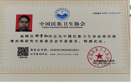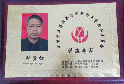 钟贵红,男,1964年出生,贵州省凯里市丹寨县公路管理段上班,少年时随父学医,在自学同时,向地方一些名医请教。医治的多是杂症重症,有的患者十多天水食不进的也治还阳,所治有男女老幼,根据不同症状施治,多数患者得到康复,靠着患者的口碑治病救人;家传多年中医,和行医经验,但认为自己学识还较浅溥,还需向大家学习,2019年4月被中国民族卫生协会增补委任为疑难病民间中医委员会民间中医成员,不忘初心争取把国人最关心的传承及健康做得更好。