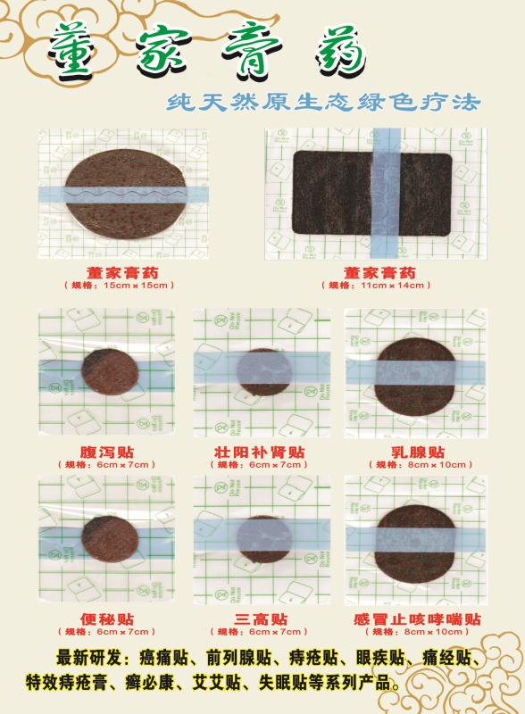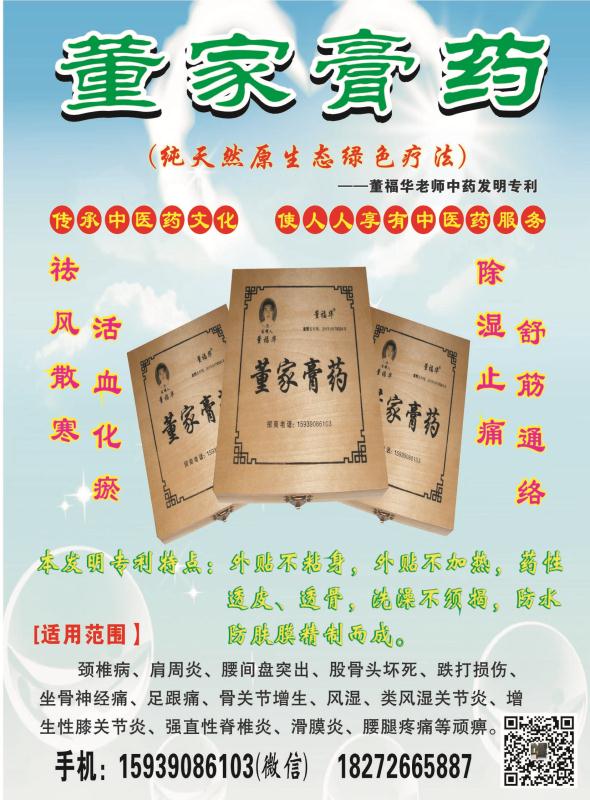 《董家膏药》纯天然原生态绿色疗法 国家中医药发明专利 董福华,男,山东曹县人氏,现暂住河南省商丘市民主西路纱厂二街,民间中医师,本人多次应“中华中医药学会(国际部)”邀请连续四届参加南阳仲景国际论坛,所写论文收录仲景国际论坛论文集。自幼酷爱中医,经过多年艰苦努力,历经无数次失败,自研成功了《骨痹膏》(董家膏药)发明专利《颈椎丸》发明专利《乳癖丸》发明专利《快胃丸》、《生命再造丸》、《养心安神丸》、《三高贴》、《腹泻贴》、《便秘贴》、《感冒止咳哮喘贴》、《痔疮贴》、《乳腺贴》、《壮阳补肾贴》、《瘦身减肥贴》、《痛经贴》、《暖宫贴》、《暖胃贴》等多个产品。所研制的发明专利产品,在国内外处于领先位置,国内外独家发明专利,开启了中医药的先河,独树一织,自成一家。连续四届参加《仲景国际论坛》,所研制的产品,应中华中医药学会邀请,多次在马来西亚,台湾,文莱,泰国,外蒙古等国参加学术交流。《董家膏药》纯天然原生态绿色疗法国家中医药发明专利 《骨痹膏》,应用现代高科技、热溶胶搅拌压制而成。具有透皮、透骨、抗过敏等优势。具有外贴不贴身,外贴不加热,仿肤防水之优势,轻者1-3贴即可,严重患者不过10贴即可。如开发出来造福无数风湿骨病患者。功能:活血化瘀,祛风散寒,除湿之痛,软化骨刺,疏通经络,搜风入骨。适用范围:风湿骨病,颈椎病、肩周炎、腰椎病、股骨头坏死、跌打损伤、坐骨神经痛、滑膜炎、增生性膝关节炎、跟骨骨刺,风湿类风湿、强直性脊椎炎等顽痹。《乳痹丸》纯天然原生态绿色疗法国家中医药发明专利 乳腺增生中医亦称乳癖,是一种发病率较高的乳腺疾病,多发于30-50岁女性,发病高峰多为35-40岁女性,男子亦有此病,极少。 乳癖之名最早见于华佗《中藏经》而后至明清外科专著记载,清·顾世澄《疡医大全》,陈实功对“乳癖”的描述较详,乳癖有乳中结核,形如丸卵,或坠重作痛或不痛,皮色不变,其核随喜怒消长。清·徐真硅《外科选要》,也有较详细的论述,如“女子乳房属足阴明胃经,乳头属足厥阴肝经。”男子乳房属肝经络,乳头属胃经络。 由此可知,“乳癖”的发生与肝、胃、冲、任等经脉有密切的关系,正如陈实功所谓“思虑伤脾,脑怒伤肝,久郁而成也”。冲任不调者,常有月经不调史,冲为血海,任主胞脉,故乳房胀痛常随月经周期、心情烦躁、郁闷而变化。 临床上两者互为影响,因妇人之乳,资于冲脉于胃经,冲为血海,隶于肝肾,肝气不舒,冲脉失调,经水一行,肝气得舒,故乳房肿块及腹痛均可减轻,两者见证虽然不同,但其内在联系却息息相关。 十年前,本人妻子也患有此病多处大医院医治无效,故本人研制了《乳癖丸》,服用8瓶《乳癖丸》治愈妻子。 本人认为,乳癖主要病因是肝、胃不和,肝火犯胃而致病,同时大多数病人乳房经络中有痰,西医亦称肿块、肿瘤、乳腺增生。药物组成:蒲公英、双花、丹皮、生芪、柴胡、当归、白芍、赤芍、青陈皮、香附子、龙胆草、牡蛎、元胡、川炼子、国老等浓缩而成。功用:疏肝解郁,和血消坚、调理冲任。适用:肝胃不和、冲任不调之乳癖。主治:乳房胀痛、乳房结核、乳腺增生、乳房肿块、乳腺炎、早期乳腺癌等症。一个月6瓶为一疗程,1-3疗程即可治愈。 近几年,本人曾用此《乳癖丸》治愈了多名大医院治不好的患者。如:山东曹县南关的回民,宝瑞(女,40多岁),曾两次到山东济南军区医院行乳房穿刺治疗两年,花费2万余元,疗效不佳,经朋友介绍到商丘余处取了8瓶《乳癖丸》、8张乳疾贴,中间一直没有音信,那时还没有手机。两年后曹县南关的患者来取乳癖丸时,问之患者宝瑞病情已知痊愈。 由此可知,中药治疗乳癖效果非凡,是“西医”无法比拟的,中药治病不但疗效好,无副作用,而且价位低,在为患者解除病痛的同时,也为患者节省了一大批不必要的费用,同时亦为患者缩短了疗程,减少了痛苦,精神上亦得到了很好的安慰。 董福华老师研发的中医药项目符合国家产业政策,属于国家重点支持项目,十三五国家规划重点立项范围,市场巨大,前景广阔,望有识知识前来洽谈合作。联系人:董福华地址:山东省曹县青菏街道办事处莘东行政村莘东村99号现住:河南省商丘市民主西路纱厂二街北路东《董家膏药》手机:15939086103 18272665887 微信:15939086103