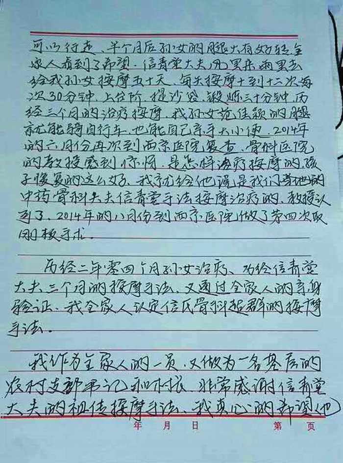 患者刘xx,家住山西省夏县祁家河乡七家村第五组。五年前因不小心右腿摔伤骨折,经信青堂大夫诊治,用祖传秘制膏药,敷用五贴,1个月内恢复劳动力,行动方便,离开拐杖。