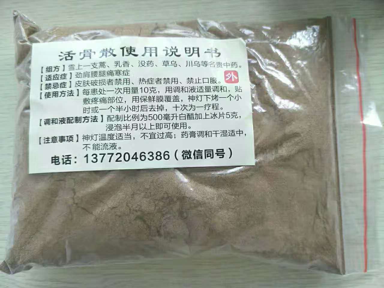 引入活骨散可使您成为一方神医,名扬四方。操作简单,省时省力,没有医疗风险,用药一次筋骨明显复位,3-10次痊愈。患者乐意,医者省心。筋骨复位散主治:颈椎病,肩周炎,腰间盘突出,腰肌劳损,膝关节增生,筋骨扭伤挫伤,风寒筋骨疼等疑难痛症。