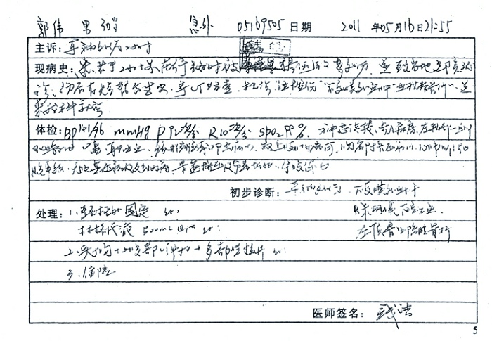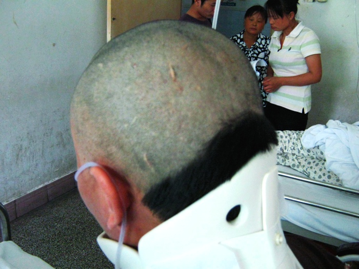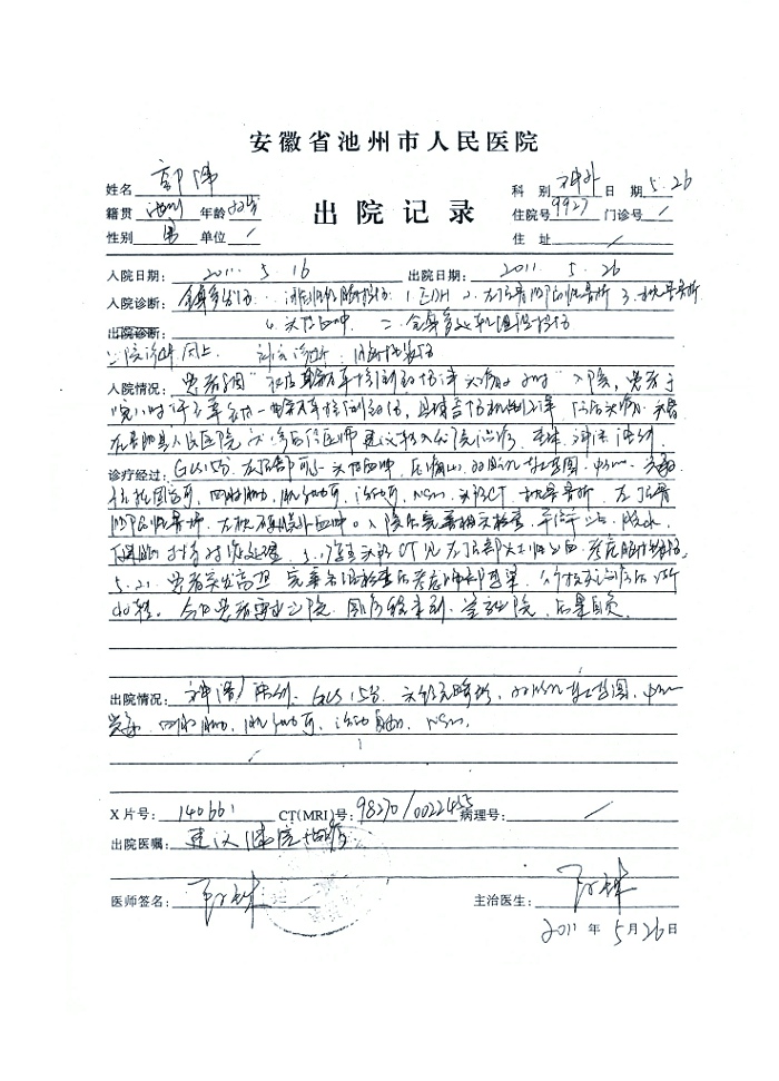治疗经过:5月17日早晨,凌丰车修中心经理张凌父亲(多年熟友)来我处请我给他儿子厂里的职工郭伟治疗因车祸造成的颅脑损伤。我凭多年多个脑伤患者的治疗经验,是有把握的,但人在医院我不好治,也不能治。他父亲说,要不搞到你家去治,我说担当不起这个风险,人都非常危险了,县医院都不敢治,能到我家吗?人命关天,救人要紧。经过商量,还是采取在医院被着医生治疗,实施我的一套医疗方案。就这样,17日上午我备好两贴中药药液,来到市医院西区二楼6房22床位看患者,患者精神萎靡,状态极差,来人无多少知觉,医院给予氧气输入,颈部套上护套,躺着挂药水。我同肇事者及家属一道被医师叫到办公室。根据患者两张CT片告诉在场的人,通过CT显示第二次片比第一次片血肿增多,医师说:“患者病情十分严重,颅骨骨陷要手术,还有骨裂、骨折。血肿区域颅内空间狭小,此部位是呼吸系统神经区域,目前血肿已占空间90%以上,再上升一点就要开刀,如不手术,血肿压迫呼吸系统神经,造成不能呼吸而死亡,随时有生命的危险,医院已做好充分准备,头发也理了,随时进行手术。”