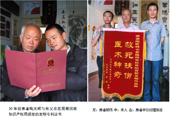 当然对颅脑损伤也不能排斥手术治疗,现在科学发达,设备先进,手术又积累丰富的临床经验,一般大都手术都很成功,所以颅脑手术是必要的,特别是出现异物入脑,出血量大而急的患者更要急需手术治疗,最好是药物保守治疗与手术治疗相互配合,而不是相互排斥,共同为了治愈脑伤患者为目的,而发展我国医学事业共同努力奋斗。对于我用中药医治颅脑损伤荣获国家发明专利,我恳切希望国家重视、实验,推广这一成果,造福于患者,造福于社会,甚至造福于人类。