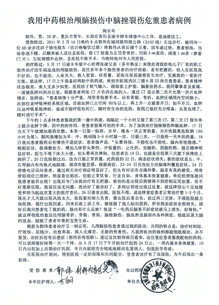 根据为郭伟患者治疗又一例说明,凡颅脑损伤患者通过我的医治,共同的特点是:治疗时间短、疗效快、花钱少、治愈率高、病人无痛苦、无新的伤害,决无药物毒害性。凡我所医治的病例都能彻底根治,永不复发,治好后没有后遗症。通过这次郭伟病历看来,这位重症患者服我配制的药剂,可以说病情好转得一天一个样,从5月17日下午开始治疗起到24日止,一周内基本身体康复,10日出院加上后期治疗巩固,半月内就能完全彻底地根治危重病人,创造医学奇迹。