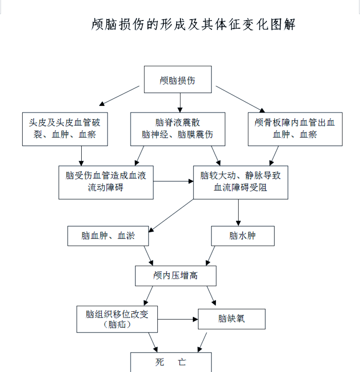 为什么出现血肿、血瘀、颅压高、水肿等等这些现象呢?颅脑是由颅与脑两部分组成,颅包括颅骨与覆盖在颅骨外面的软组织——头皮。脑包括大脑、小脑、脑干、脑神经、脑血管和覆盖在脑表面的脑膜。就很薄的头皮从外向里分为5层:1、皮肤层;2、皮下层;3、帽状腱膜层;4、腱膜下层;5、颅骨外膜。皮下层内有丰富的血管,头皮裂伤时,出血很多。腱膜下层是一层疏松的蜂窝组织,有出血感染时,容易在这一层内扩散,可弥漫到整个头部,有时还可将感染带入颅内。当一个患者颅脑损伤后,首先头皮保护层损伤,头皮及头皮血管有可能破裂造成血肿和血瘀,脑内的脑脊液(老百姓称脑浆)震散,好比豆腐一样落地震散,脑血管、脑神经、大、小脑及脑干、脑膜等在受伤的部位都有不同程度震伤,还有颅骨及颅骨板障内血管破裂出血和瘀血。脑血管受伤后造成血液流动障碍,或外溢,造成脑血肿、脑瘀血,时间长些,由血肿的血化成水,造成脑水肿,还有脑血管受伤造成循环血液受阻,血管破裂,流出的不是血,而是由瘀阻的血不能流动,便由血化成水,从破裂处流出,虽然血和水都是液体,但血有厚度,受阻血瘀停滞,化水是造成脑水肿的两个方面。从而造成颅内压增高,颅腔容积与内容物的体积失去平衡,而同时脑的循环血液供应不允许减少,就会引起颅内压增高。使患者出现头痛、呕吐、昏迷。颅压增高,邻近脑组织常被推移,还有大量出血和瘀血,也被推移脑组织,而改变位置,叫做脑疝。严重脑疝造成脑缺氧,患者表现呕吐,血压改变,昏迷,瞳孔扩大,肢体瘫痪,不及时抢救就造成生命的危险。