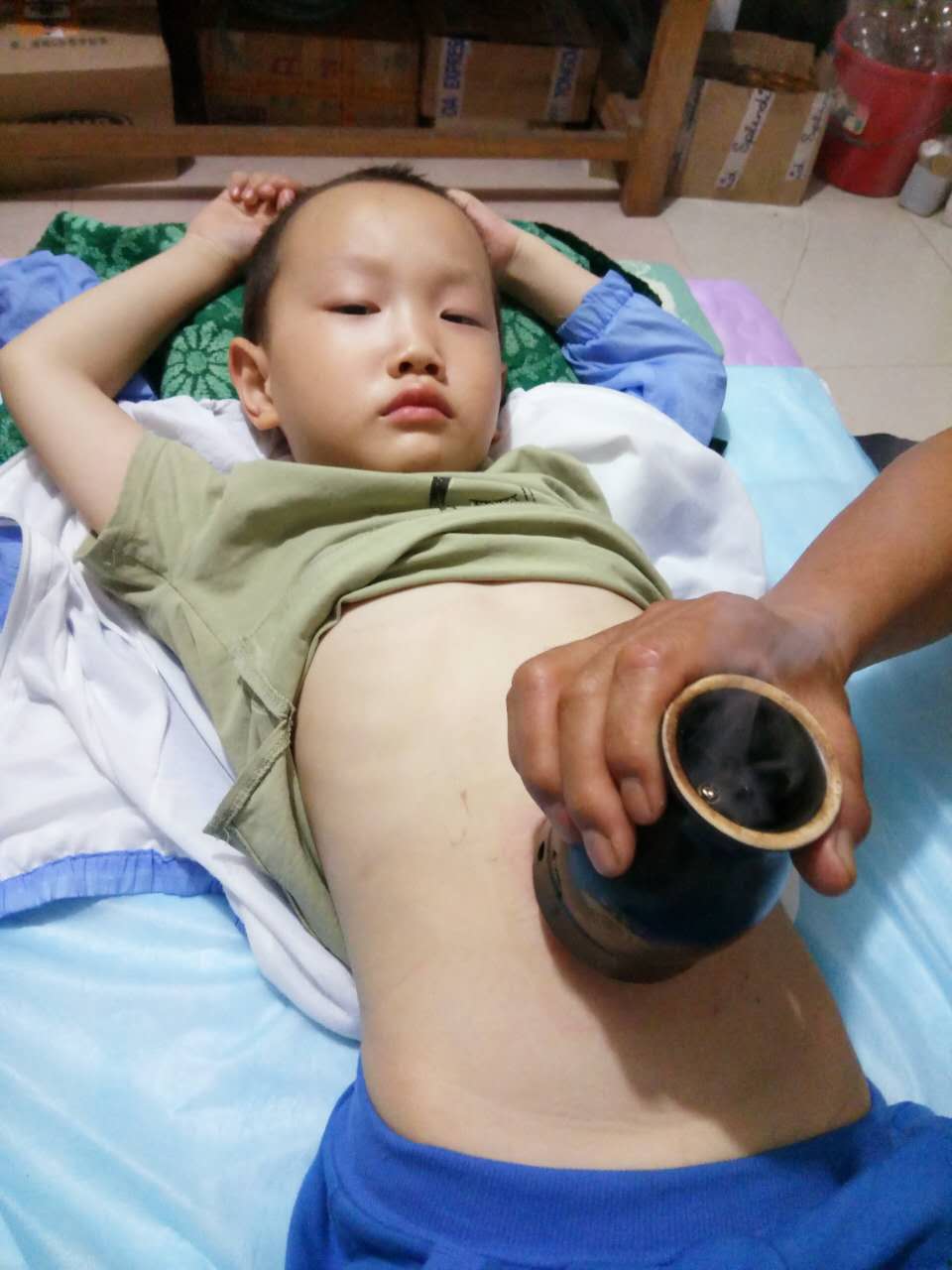这是一个小儿胃疼肚子疼的,用艾灸刮痧罐治疗一次见效