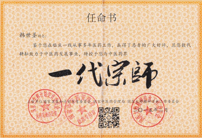 2011年成为中华医学国际发展联合会主任委员,同年任命为“中华医学国际发展联合会特色疗法推广工作站”主任,2012年2月应邀担任中华医学国际发展联合会中华名医理事会副会长。2015年评为中华国医导师。2012至2015年特邀参加“全国第三、四、五届共和国经济建设人物暨科技创新峰会”并荣获科技建设“创新专家”称号,颁发证书和纪念金鼎。授予其单位为“全国医德标兵建设先进诊所”。全国医药科技创新示范单位,“中国民间中医疗法临床示范基地”。获得国家批准成立“江西省分宜县国医堂”,同时授予为国家疑难病定点研究单位。任命为“国医推广大使”,“国家疑难病研究课题组江西省组长”。2016年3月被国家评选为“全国诚信医疗单位”。同年5月【中医诊法(韩氏传统疗法)中华国医一代宗师】,被列为“国家级非物质文化遗产”名录,获得中华人民共和国国家卫生和计划生育委员会、国家中医药管理局批准建立“国家级中医药大师授徒基地”,全国中医大师传承中心。下达公文挂匾,颁发证书授权书。