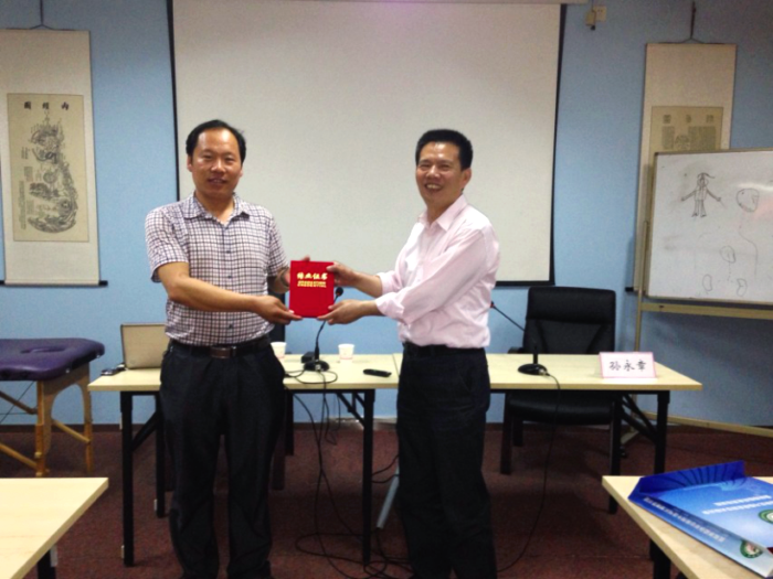 北京中医药大学针刀主任郭长青教授给殷学伍医师发荣誉证书