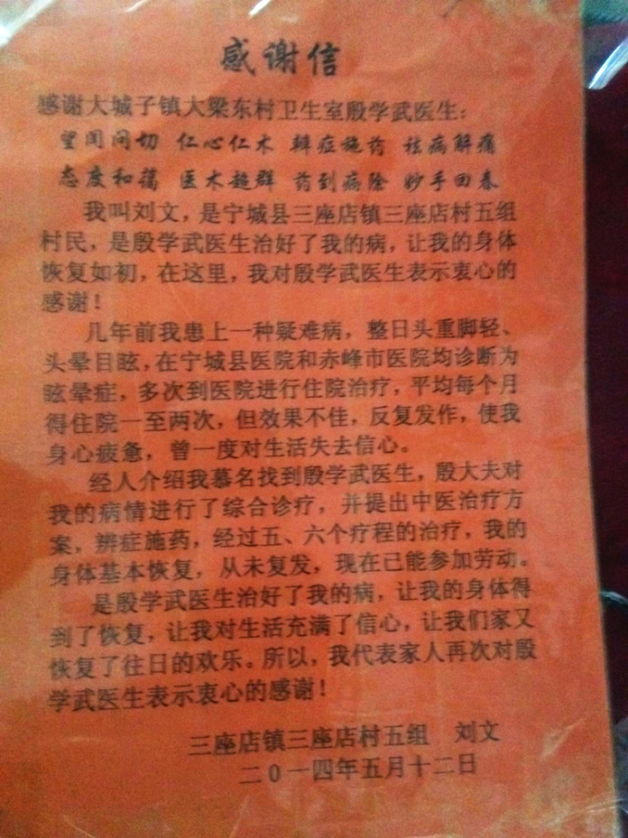 病例4:王某,女,65岁,内蒙古赤峰市宁城人。因头晕不适来量血压,当时血压(240/140mmhg),询问其家属及本人否认有心脑血管疾病病史,但结合脉象及脏像,预测患者患有脑血管疾病。嘱于病人及家属应紧急配合治疗不能转院,就地治疗(我诊所距县医院还有50公里的路程,一运动有突发脑出血风险),应用殷氏疗法针灸拔罐,十分钟后血压降至(200/120mmhg),同时静脉给与降压药,两小时后测血压降至(160/90mmhg),继续治疗七天后,血压下降至155/85mmhg,成功的挽救了患者的生命。
