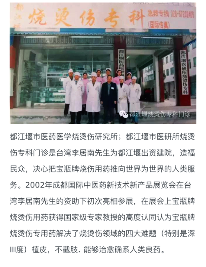都江堰市医研所烧烫伤专科门诊是台湾李居南先生为都江堰出资建院,造福民众,决心把宝瓶牌烧伤用药推向世界为世界的人类服务。2002年成都国际中医药新技术新产品展览会在台湾李居南先生的资助下初次亮相参展,在展会上宝瓶牌烧烫伤用药获得国家级专家教授的高度认同认为宝瓶牌烧烫伤专用药解决了烧烫伤领域的四大难题(特别是深Ⅲ度)植皮,不截肢. 能够治愈确系人类良药