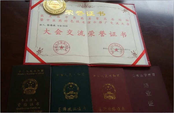 •水气病脉证并治》篇中的这样一段话:“风气相搏,风强则为隐疹,身体为痒,痒为泄风,久为痂癞”,才恍然大悟:原来早在东汉时期,医圣张仲景就用这一句话已经揭示出皮肤瘙痒性疾病的病因是,中医五脏六腑中肝与肺功能失调所造成的。灵感瞬间被激发,根据这一理论,徐海波医师找到了一把开启治愈皮肤瘙痒性疾病的“金钥匙”,创立了《乌梅口服液》、《全瓜蒌口服液》、《菟丝子口服液》、《生地黄口服液》、《乌梅连轺赤小豆口服液》、《乌梅桂枝人参口服液》、《茵陈蒿口服液》、《薏苡竹叶口服液》等系列方剂,其中《乌梅口服液》、《全瓜蒌口服液》、《菟丝子口服液》、《生地黄口服液》已申请国家发明专利,并被国家知识产权局批准授予国家发明专利权。