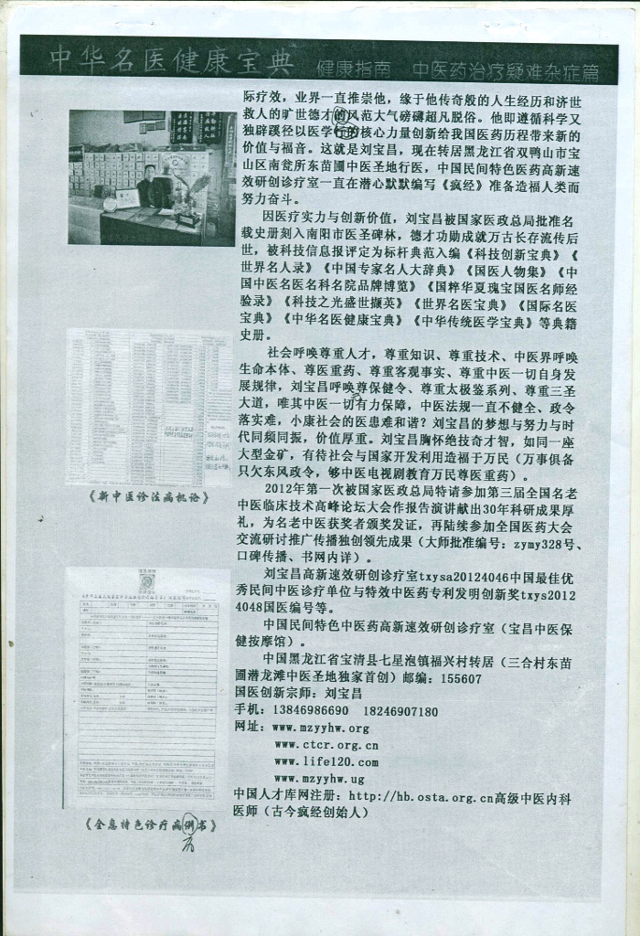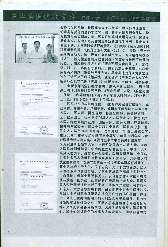 98年转诊疗疑难杂症与心理学诊疗等而独立撰著科研论文数篇,陆续发表问世(无尝贡献国家),保健令,太极鉴。新中医诊法病机论五十条、新中医治法先机论六十条、同法源机论五十条、症法候机论、东北天然药物实地考察、单味品速效药研究新发现、新中医案例三十则、传说中药神奇,故事美丽动人、白矾临床应用新进展、炭剂十用、牙疼病速效治验、读内经颠狂篇有感诗一首、探析灵芝古今源流、东北绿色品苍术的应用研究与发展方向、民间药方治疗失眠、家传独特秘方四十首、中国民间名医临床秘验良方七首、论中华名医临床实践新发现与研创进展、新世纪医学诊疗病历书、论刘宝昌三腔用药式、医中之医新鉴、中医特色药应用研究新发现、民间中医罐术疗法最新进展、《十大问候》《垂法福世》《国医徽正宗》《实现山川秀美,必须强基固本》等等重要成果,贡献突出被评定健康使者、特效好医师、健康卫士、杏林医学创新人才、中华名医、医界名家、医德双馨等荣誉称号、荣获金牌、牌匾、锦旗、授带、金杯、功勋章、诚信金鼎、标牌等!有荣誉证书、学历证书、论文证书、创新证书、会员证、委员证、毕业证、学员证、专业技术证、代表证、记者证、特色专家证、高级研究员证、职业资格证、结业证、学业证、培训证、聘书等!有邀请函、特请函、通知函、文件函、入编函、评审函、赞誉函、征文函、登记函、公表函、咨询函、求医函、请柬、会议函、入典函、入网函、诊疗函、领奖函、加盟函、申请函、培训函等等珍贵资料依存,醒世惊人事迹用名信片与口碑传播飞扬,已编入《世界名人录》《中国健康博览》《国家核心期刊数据库与信息网》《中华名医专家大辞典》《世界名医宝典》《国际名医宝典》等史册, 自学成才、业绩坎坷、惊人传奇、事再发展、当评宗师,请您详查。