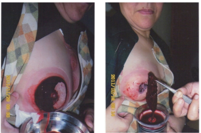 2009年7月来沪排毒,五次肿块变软缩小。2011年9月——12月排毒八次,取出约200CC粘稠瘀血(有的称“毒液质”),乳块明显变小、变软、变松,亲人们十分高兴,不用开刀,放、化疗。因家在大连市,暂回老家,乳块有变再来沪排毒。