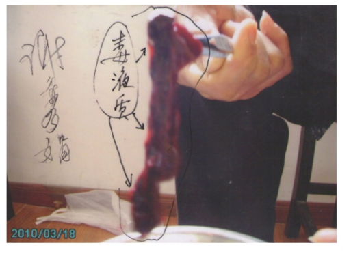 2012年6月8号至16号,专程到上海请求中医排毒通经。9天时间,排毒通经七次,在鼻、耳、颈部排出200CC瘀血积液,好几罐是白色脓液,其中一次排出的毒液使整个房间都充满臭味。