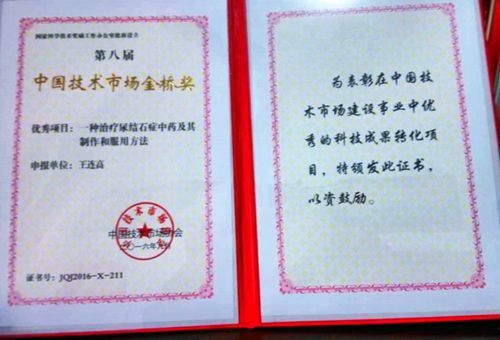 2012年10月,国家知识产权局授于"一种治疗尿石症中药及其制作方法"国家发明专利,专利号:ZL201210279626.1