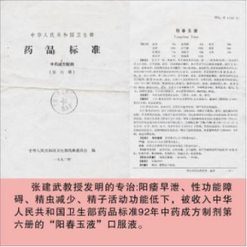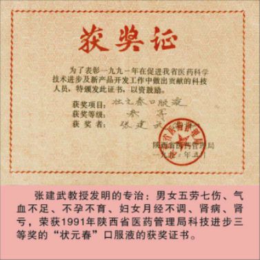 1985年张建武教授研制出的第一个新药是专治男女五劳七伤,气血双亏的"抗疲增精宝"口服液,轰动了当时的整个陕西中医学院,连当时的院长,现在的中国首界最年轻的国医大师张学文教授都说:"张建武是咱中医学院的人才",张建武教授研制的第二个新药是专治阳痿早泄,性功能低下的"阳春玉液"口服液,这2种新药为改革开放后86年陕西省首批出口国外8种中成药中的2种,其中"阳春玉液"被收入卫生部颁药品标准,到现在三十多年了全国还有几十家药厂在生产。兴平店张患者吕某患阳痿夫妻性生活不协调离婚,二婚后又面临离婚的危险,服用张建武教授发明的"阳春玉液"口服液三个疗程,彻底治愈;张建武教授86年研制的第三种新药为专治不孕不育,肾虚肾亏的"壮元春"获陕西省医药管理局科技进步三等奖,兴平市运输公司张某婚后无子多年,经服用张建武教授发明的"壮元春"口服液2个疗程顺利生子。