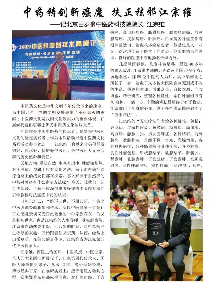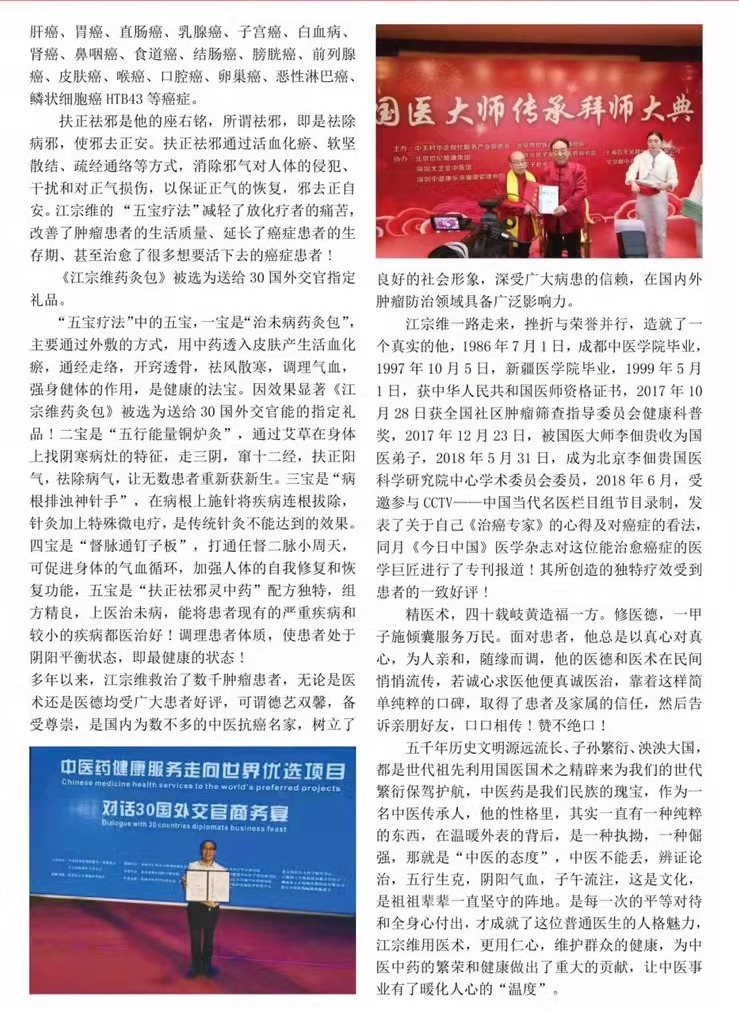 江宗维作为一名中医的传承人,历经四十多年的刻苦钻研,艰苦跋涉,访遍名医,足迹踏遍全国20多个省,,拜59位中医高人为师,集中华南北之所长于一身。他尊师古训、博采众长、穷极本源、广收博蓄,精于研究,整理眢种良性、恶性肿瘤组方有70余种,一病一方,辛勤的耕耘最后终于有了收获,江宗维用了全身的心血,终于在全国范围内独创了“五宝疗法”,治愈了众多被大医院宣判死刑或不收的患者。从祖先留给我们的民族魂宝中探寻癌症的治疗之法。