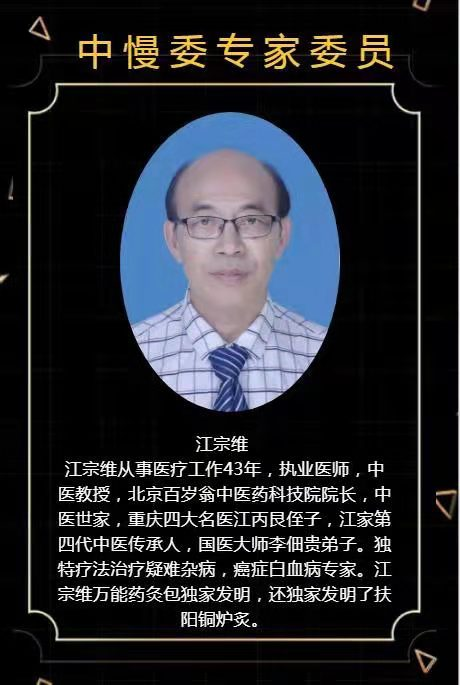 江宗维执业医师,中医教授,北京百岁翁中医药科技院院长,中医世家,重庆四大名医江丙艮侄子。他的伯父是制药世家,也是江宗维的人生导师,受家庭熏陶,江宗维自幼热爱中医,七八岁的时候,对中草药产生浓厚的兴趣,开始跟着伯父识药、认药,经常上山采草药,在伯父的真传下,江宗维成为江家第四代中医传承人。