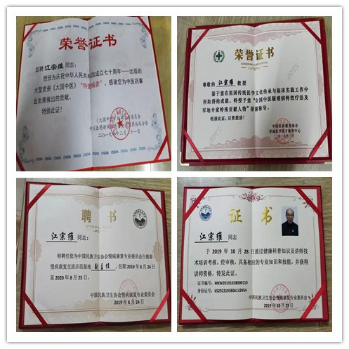 千淘万漉虽辛苦,吹尽狂沙始到金。经过42年在民间基层的积淀,如今花甲之年的江宗维凭借一身过硬的医术在业界开始崭露头角。2017年10月,他获得中国民族卫生协会肿瘤防治专业委员会全国社区肿瘤筛查指导委员会颁发的健康科普讲师证书;2018年7月,成为中国民族卫生协会慢病康复专业委员会专家委员;8月,在成都第三届民间中医节上荣获了最佳中医传承奖;10月,在陕西天地人中医研究院荣获工艺奖杯。他说:“希望通过自己的努力,让我们祖传的中医技艺得到进一步深化,更好地践行医者的使命”。