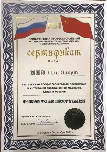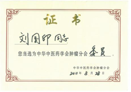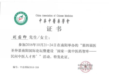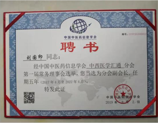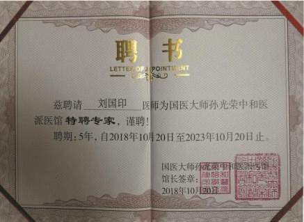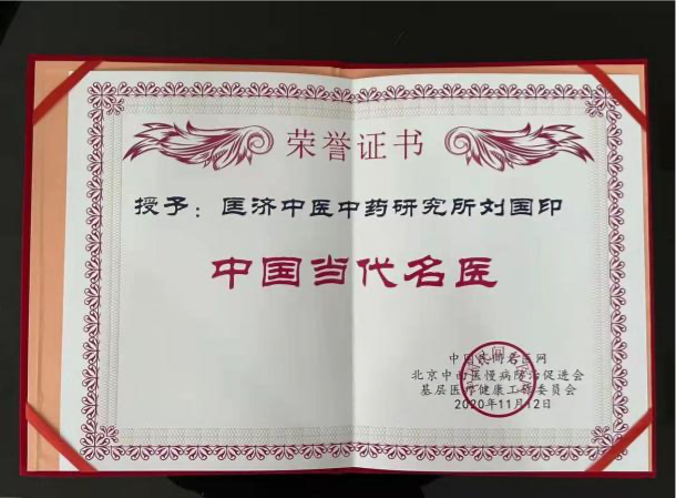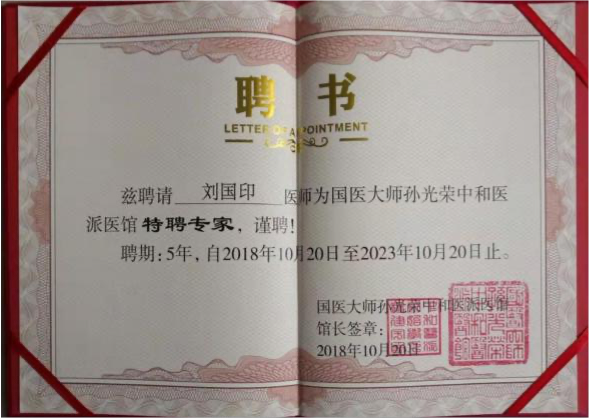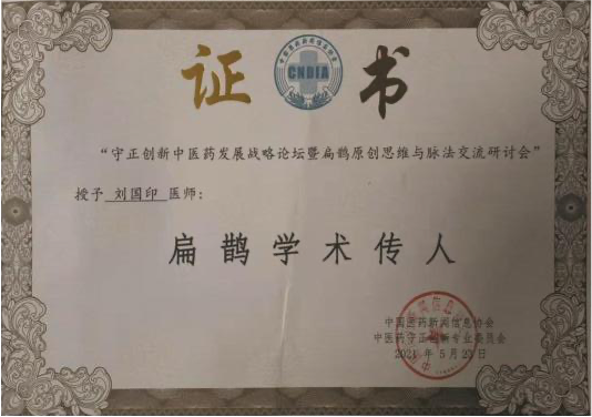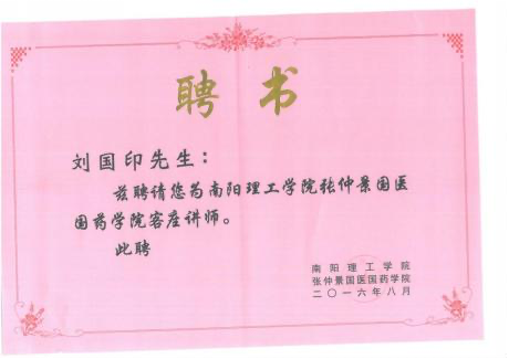 第七代刘国印,系刘鑫石四子,博览群书,集诸家之长,在南阳 医圣街行医,诊治内科杂病,尤擅瘕聚癌瘤,人称“小仲景”。2014, 2017 连续两届当选区人大常务委员会委员,连年为区、市中医药事 业发展提交议案建议,被相关部门采纳落实。2020 年当选为“中国 好医生”和“中国当代名医”;2017 年当选国家级学会——中国中医 药信息研究会中西医汇通分会副会长;2012 年荣获“河南省仲景学 术传承奖(先进个人)”;2016 年当选中华基层卫生联合会南阳分会 副会长;2013 年荣获中国科技创新发展促进会传统医学分会授予“中 医肿瘤专家”;2011 年当选中华中医药学会肿瘤分会委员,2012 年荣 获该会“全国中医药肿瘤防治先进个人”称号;2012 年 7 月被聘为 南阳理工学院中临床实践指导老师;2016 年被南阳医学高等专科学