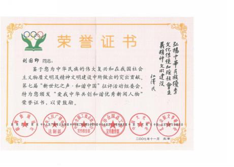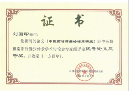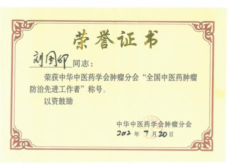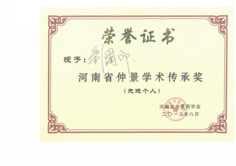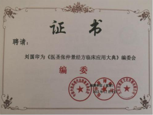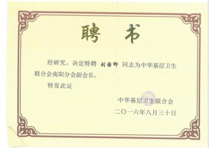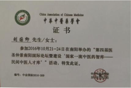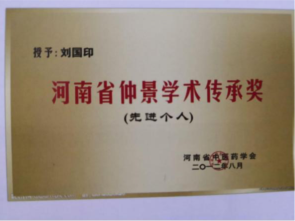 者”称号;2012 年 8 月被河南省中医药学会授予“河南省仲景学术传承奖先进个人”; 南阳市 “宛城区名中医”、“南阳市名中医”; 南阳市七代中医世家(内科)刘积庆堂掌门人。