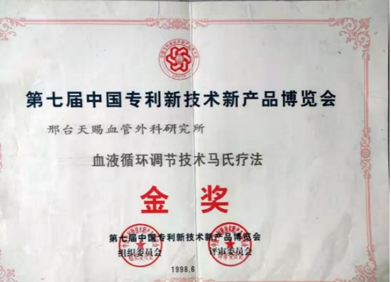 1998年-发明的马氏血液循环调节技术在河北省科技厅领导组织下参加了中国第七届专利新技术新产品博览会并荣获金奖;