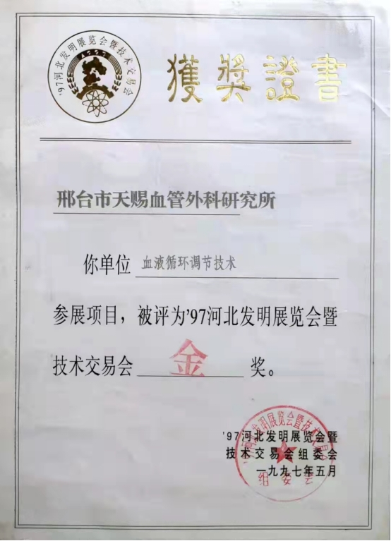 1997年-发明的马氏血液循环调节技术在邢台市科技局领导组织下参加97河北省科技发明展览会并荣获金奖;
