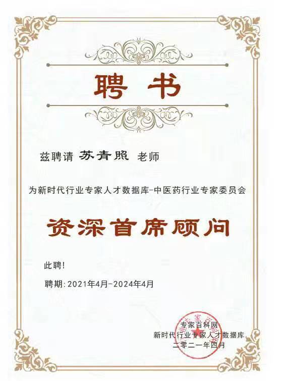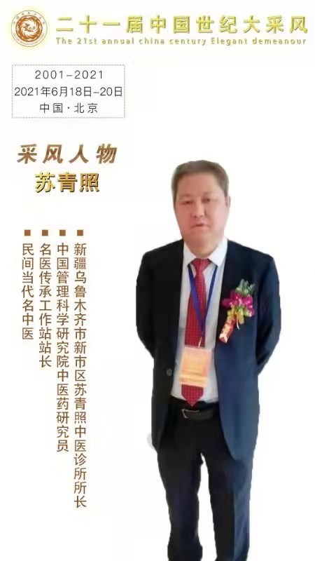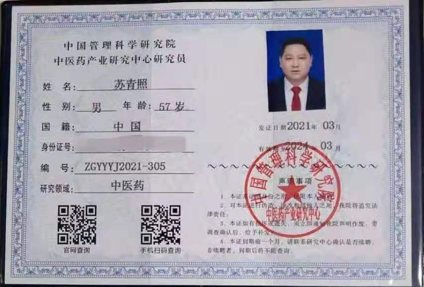 2021年3月,中国著名中医苏庆钊乌鲁木齐新城区,任中国管理科学院中药产业研究中心研究员。研究所已向苏清照颁发有效工作证明,开展中医药研究工作。