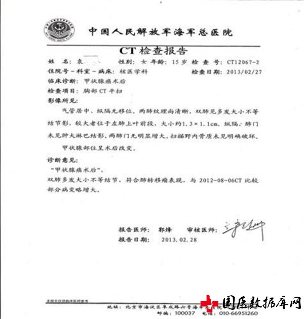 2013年,袁女士,15岁,甲状腺手术后,双肺多发性肺转移,经治疗一年,至今未复发。