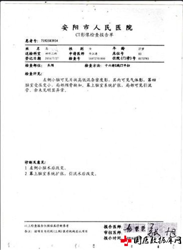 2016年 9月 8日,高女士,27岁,左侧小脑占位术后改变,每日高烧,蛋白升高,头颅疼痛,经治疗一周后,一切正常。