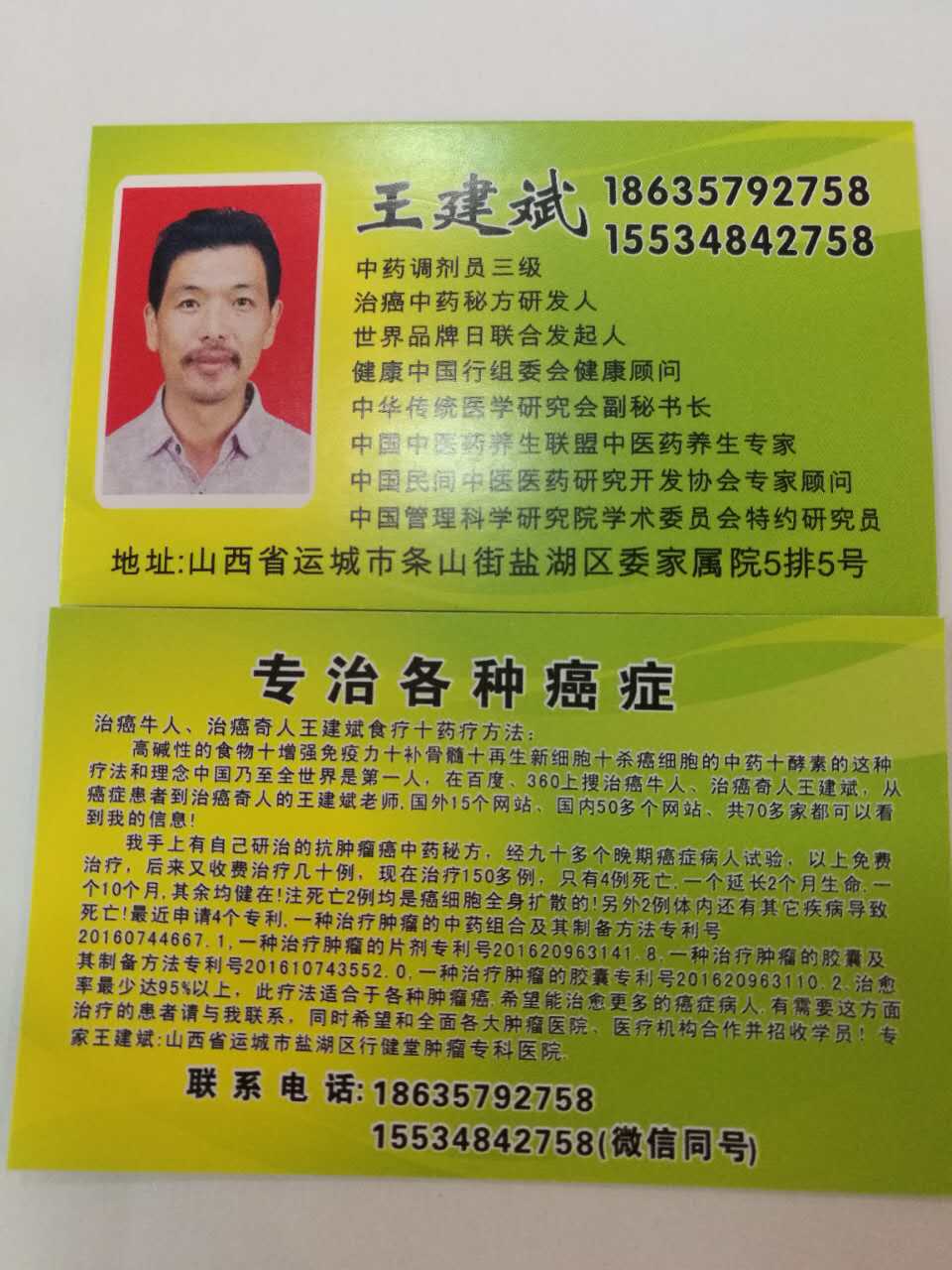 联系我们:山西省运城市盐湖区行健堂肿瘤专科医院 王建斌医师 18635792758 微信:15534842758