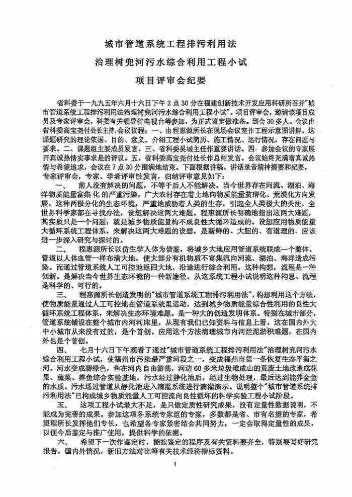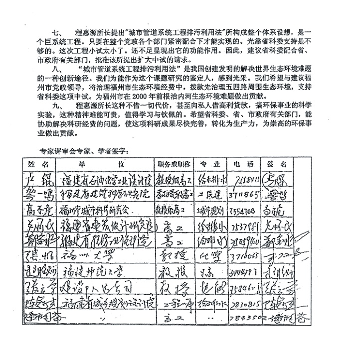 本发明是一种人工可控,促进城乡物质能量良性物循环的,城乡统筹规划,因地制宜、综合利用,综合发展的巨系统工程,是一种能促进城乡生态环境,社会,经济共同发展和三大效益和谐统一的社会基础工程。它为自主创新,建设创新型国家,建设有中国特色的和谐生态社会,创造出一条科学的道路。全面推广本专利,能多快好省地破解因城乡生态环境恶化而产生的五大难题,为建设和谐、美好、良性循环的生态社会作出贡献。 本发明公开了一种城乡管道系统工程排污与利用综合体系结构,属环保中污水处理与利用系统。由下水道及道路的下水沟及阴井构成的污水排放管道或沟连接泥、砂和悬浮物处理井,处理井的另一端连接污水输送管,污水输送管是埋设在已有城镇河流的河床里的,在污水输送管管道交叉处设置有阴井;污水输送管的上端设有出气口,出气口的上端连接有气管;污水输送管与气管的终端连接污水综合处理厂;污水处理厂的另一端由管道经泵房的水泵连接至储水库,储水库设有输出的阀门与管道,其中设有灌溉,清洗专用的各种管道。本发明不仅彻底治理城市污染和化害为利,为农村输送急需的原料与肥料的问题;而且指明了人类未来社会经济建设发展的必然之路。中发明人程惠源先生从20世纪70年代初开始,从基础理论研究再到技术实践,终于作出该发明。历经三十多年科研,发明人发表过多篇论文和研究报告,如《关于城乡管道系统工程排污利用法研究报告》与《城乡管道系统工程排污利用法治理树兜河污水综合利用工程小试》,分别在1993年与1994年被福建省科委列入高科技立项,发明人投资45万元,省科委投资18万元,获得成功,1995年被福建省科委组织有关单位专家,学者评审为“国内外首创”,得到“是解决当今世界生态环境的一种创新途径”等高度评价。 发明人于2005年5月向国家知识产权局申请专利:2006年5月提交PCT国际申请,2006年12月7日获公布。本发明引起国内外科技界、媒体高度重视,被推介参加国内外科技展、贸易会,先后获得德国,香港国际科技展金奖,2007年至2008年获得国内外重大科技奖5次金奖,获得第七届中国科学家论坛“最具投资价值的能源/环保项目奖”。本专利的价值被评估为6.39亿美元。程惠源先生被评为高级工程师,先后获得“发明创业奖”“自主创新风云人物”“全国先进爱国企业家”等荣誉,被有关单位聘为特邀高级研究员,特邀高级专家导师。程惠源先生及本专利被《2008年中国公益事业发展年鉴》《创新中国》《中国学者》《影响中国的500位专家》《中国专利发明人年鉴――建国六十周年百名优秀发明家成就展示》《中国发明与专利》《中国知识产权报》《科技日报》、《中国贸易报》等大型书籍与报刊予以宣传、推介,程先生发表了他的爱国倡议和报国宣言:“以水建国――创新和谐、富强、美好、生态国家”,被核准镌刻在长城“中华爱国功德榜”上。 本专利是在学习、弘扬中华民族“天人合一”理念,遵循生态农业理念的基础上发明的。发明人发现自然界和人类社会存在一些新的规律和问题,于20世纪60年代发现“物质能量集中分散运动循环规律”(也称“第三定律”),于20世纪70年代自主创立了“人控循环理论”“人控生态理论”,与现代科学技术相结合,作出本发明。它是智慧的结晶,具有综合性的多功能,利用它,能产生巨大的城乡物质能量人工可控良性大循环的神奇功效,可谓“一箭射五雕”。 我们中华民族有过创造出“四大发明”的光辉历史,也必然会有震惊世界的光荣未来。本发明就是一个面向未来的发明。投入开发本专利,是一项一本万利的事业,是造福于中华民族子孙后代、造福于全人类的伟大事业。欢迎国内外有关机构、投资商、企业家和各界人士前来诚信合作,共创共赢,共创辉煌。联系人:程惠源电话:13600807746