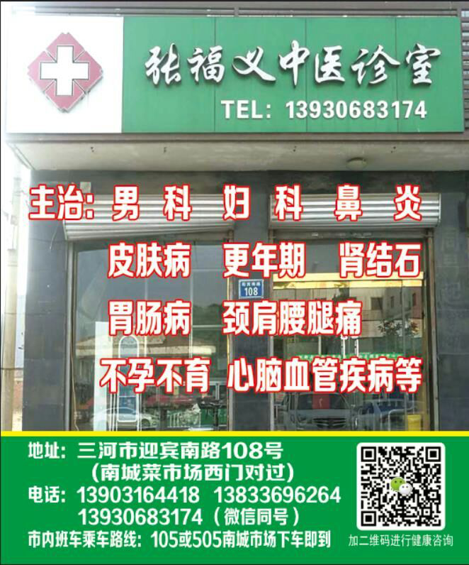 张福义老中医行医四十多年,曾任三河中坛水泥厂医院院长,又在三河民寿堂坐诊多年,后在三河迎宾南路108号开办诊所至今,经手治疗大量病例,深受患者好评!