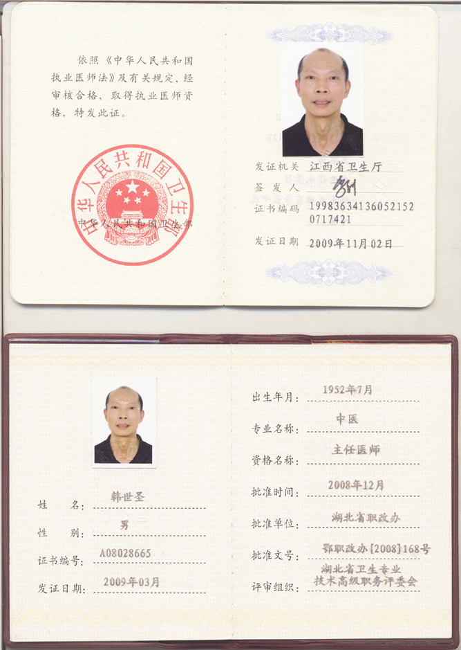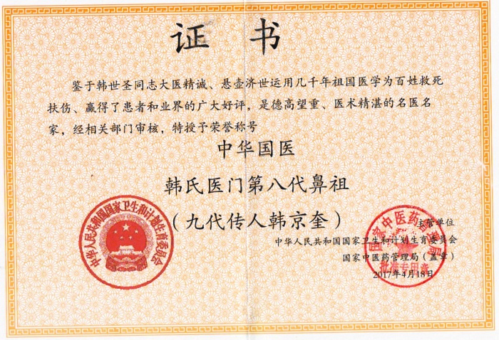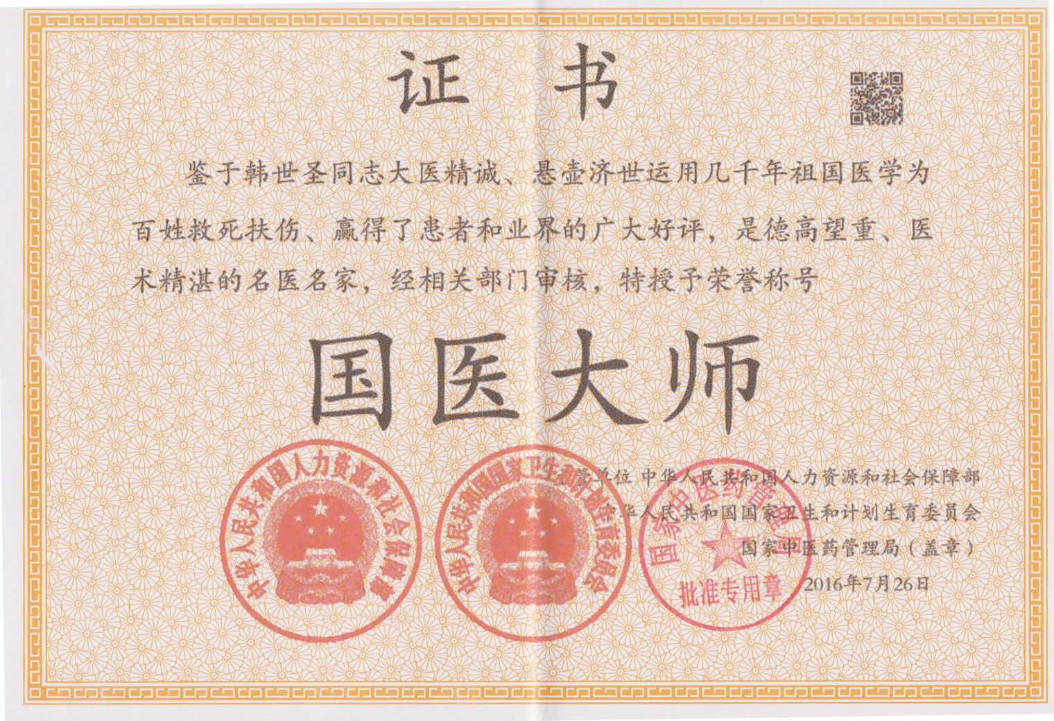2011年成为中华医学国际发展联合会主任委员,同年任命为“中华医学国际发展联合会特色疗法推广工作站”主任,2012年2月应邀担任中华医学国际发展联合会中华名医理事会副会长。2015年评为中华国医导师。2012至2015年特邀参加“全国第三、四、五届共和国经济建设人物暨科技创新峰会”并荣获科技建设“创新专家”称号,颁发证书和纪念金鼎。授予其单位为“全国医德标兵建设先进诊所”。全国医药科技创新示范单位,“中国民间中医疗法临床示范基地”。获得国家批准成立“江西省分宜县国医堂”,同时授予为国家疑难病定点研究单位。任命为“国医推广大使”,“国家疑难病研究课题组江西省组长”。2016年3月被国家评选为“全国诚信医疗单位”。同年5月【中医诊法(韩氏传统疗法)中华国医一代宗师】,被列为“国家级非物质文化遗产”名录,获得中华人民共和国国家卫生和计划生育委员会、国家中医药管理局批准建立“国家级中医药大师授徒基地”,全国中医大师传承中心。下达公文挂匾,颁发证书授权书。