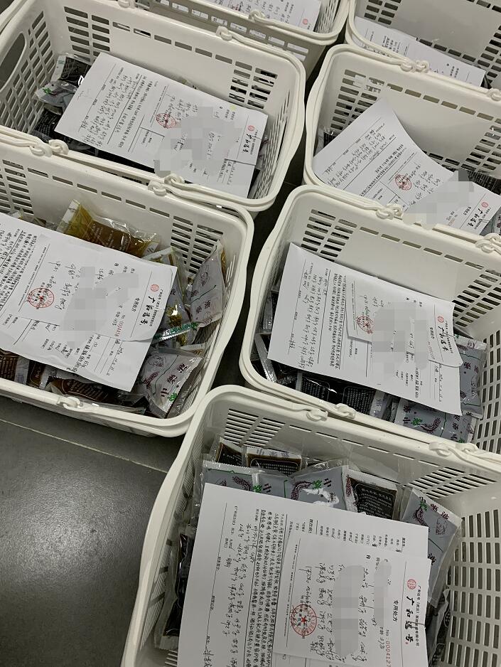 旁边的筐子里就是为患者熬制好的中药,患者的档案表和中药一起归类摆放,整个过程十分严格。经过八卦配伍,按照时辰熬制好的中药,本地患者可自己来取,外地患者就通过快递过去,过程还是很高效便捷的。