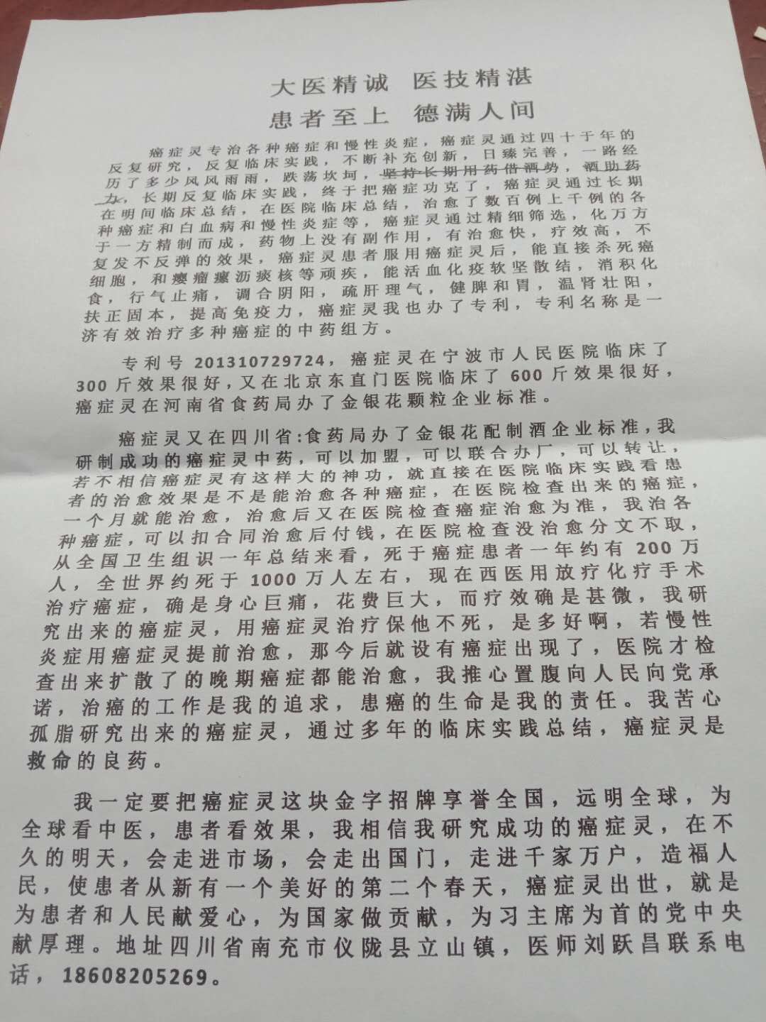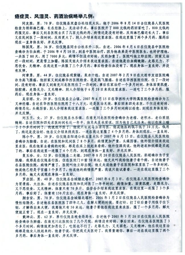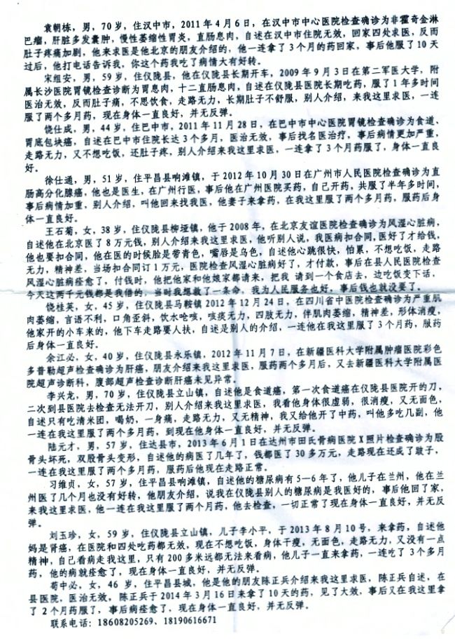 三十年的苦心钻研,三十年的孤诣拼搏,反复研究,反复临床实践。化万方于一方,不断补充发展,日臻完善,成功研制了癌症灵风湿灵,用癌症灵风湿灵治愈了许多的危重癌症患者,夺回第二次生命,自己一直德技并济实事求是的治病原则。真心为患者服务,取得了看得见摸得着的实际疗效的硬道理,让治愈的患者作证,治愈后不反弹,不复发,癌症灵、风湿灵治愈各种癌症和疑难杂症,能彻底治愈,又无毒副作用,赢得了社会各界人士的尊重和患者的信任。