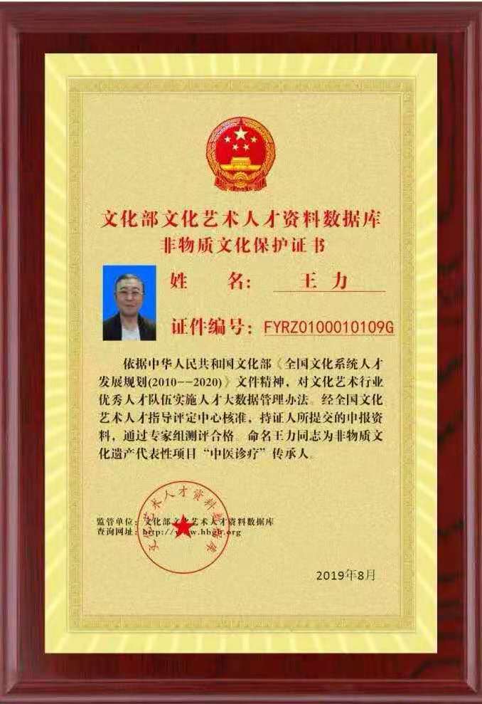 的研究、传承和发展。在传统中医文化的研究中从祖传到师承,研究使得中医哲学理论体系与传统治疗手法的高度融合并且推陈出新。深刻领悟阴阳平衡、五行中的相生相克理论研其理论究其表象,注重体现唯“体用”二字。更在“望诊”方面有比较深层次的研究。王力在行医过程中,始终坚持认为:诊疗中非传统中医不能治大病!另外,在药剂的炮制方面,依然坚持采用祖上遗留之九蒸九炮及阴阳法则的传统炮制方式。如此才能保证药效的神奇和迅速解除病痛。经过多年的经验积累,如今王力老师在治疗糖尿病、高血压、痛风、溃疡性结肠炎、肾炎(各类)、牛皮癣、重症肌无力、婴幼儿脑瘫、男科、女科、各种骨病痛等疾病(包括:强直性脊柱炎、腰间盘突出、颈椎病)等等疑难杂症方面,得心应手,经患者反馈,治愈率极高。
