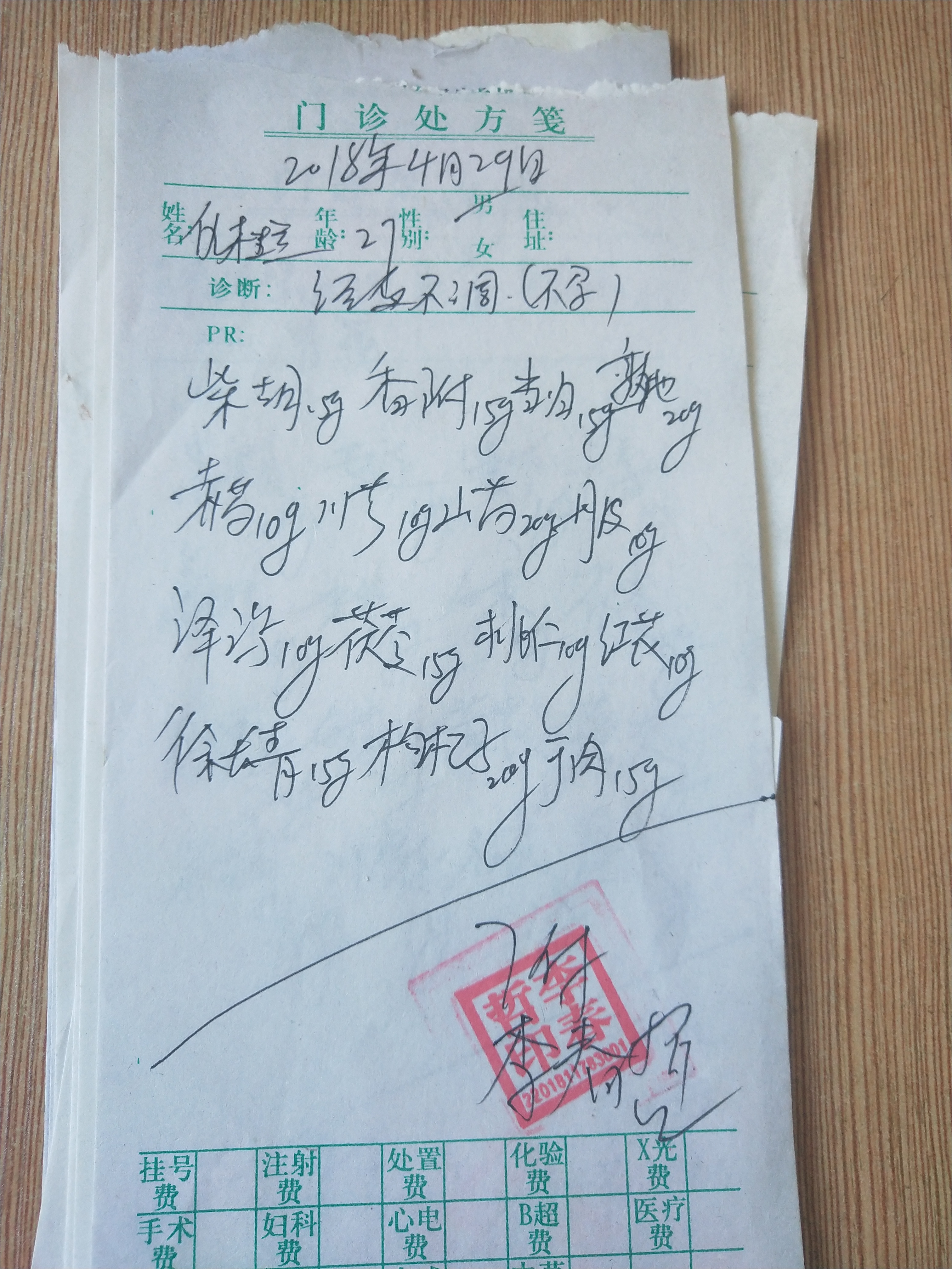 二诊:五月十号,服药10剂后来诊,腰酸,心烦易怒,都有减轻,并且服药期间来了两天月经,量少但以没血块。