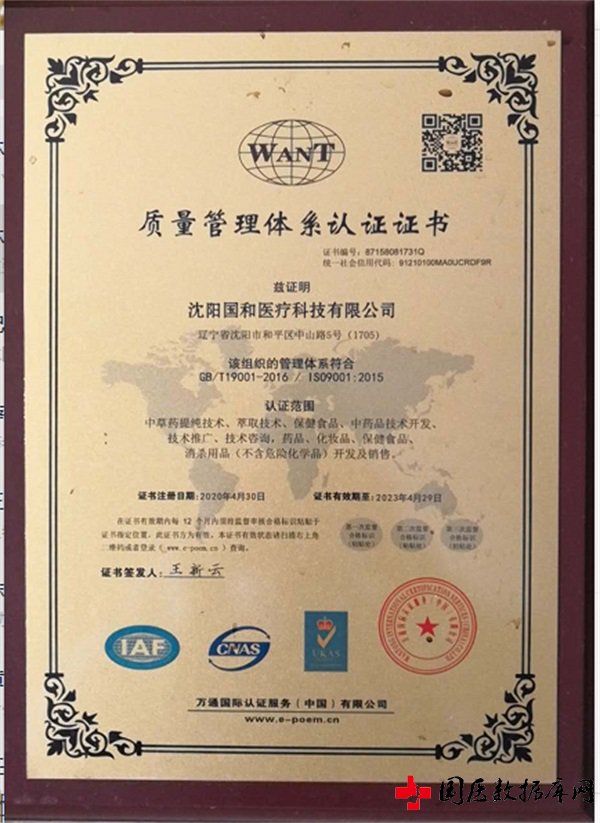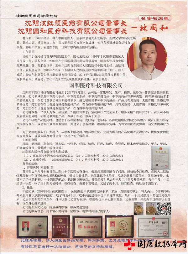 国和医疗科技沈阳国和医疗科技有限公司成立于2017 年8月2日,公司是一家集研发、生产、销售、服务为一体的综合性高新技术企业。公司领 域涉及中草药化妆品、中草药消杀品、中草药保健食品、中草药药品等多种类别。公司拥 有多名高技术水平的研发人员,在公司董事长林国和的带领下,成功研制出多种中草药成 品,产品具有见效快、无副作用、价格低等多种优势,是实实在在收益于普通百姓的好产 品,在百姓中有很好的口碑。
