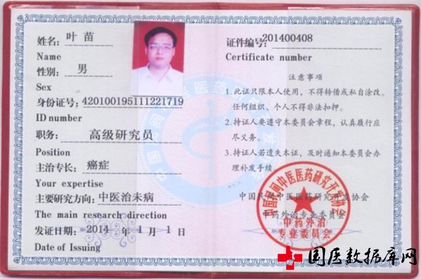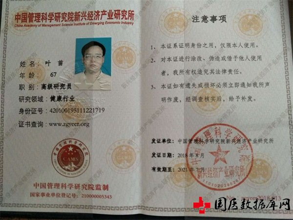 叶苗,1951年生,浙江金华人,武汉市江城跨世纪研究所所长、武汉紫炫光电子生物技术研究院院长,十三五中国大健康产业示范基地主任,中和国医(北京)国际医学研究院中医癌症科专家委员,中医科技消灭癌症学科带头人、高级药剂师、高级治未病诊疗师、高级工程师、中国管理科学研究院高级研究员,主要从事以中医药理论为框架结合现代物理学中的电子学、医学、分子生物学为理论基础的 光粒子在人体生命科学领域中的应用实践的研究。