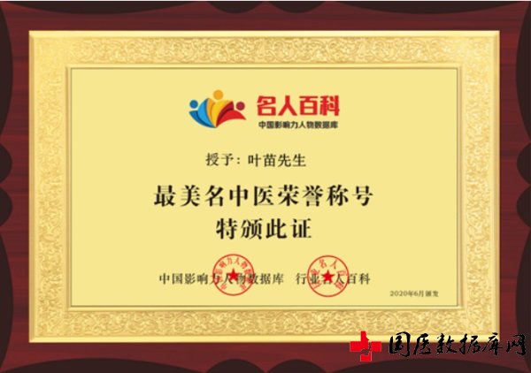 2017年3月中国国医大师石学敏亲传弟子,2017年中国国际科技促进会鉴于叶苗先生为我国科技事业的繁荣发展所作的努力和贡献,特别是中医事业上取得的杰出成就,特邀请入编迈向世界的