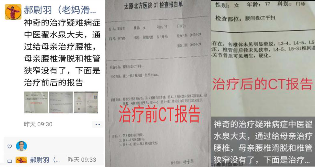 案例3:腰椎滑脱、椎管狭义窄---上面是郝女士在她朋友圈的分享。其母亲腰椎滑脱、椎管狹窄,行走艰难、站立不稳。经翟水泉老师几十秒钟的治疗,已全部正常。有治疗前后的CT检查报告为证。