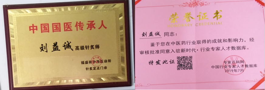 2018年,福盛堂国医馆被评为最具人气三等医馆;荣获全国名老中医临床高峰论坛十周年优秀中医人物展播名誉证书,大道之行、国际报告文学研究会颁发荣誉证书;被国家卫建委评为“中医专家”称号;