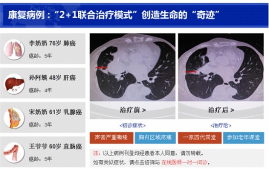 经过我们治疗很多的肺癌患者短的五年,长的十八年以上仍健康生活。如重庆市黔江区人,郭立,男,68岁;老先生患肺癌;在重庆西南医院、湖北恩施市医院,黔江地区医院,在医院CT检查诊断为恶性肺癌晚期、转移胃肿瘤、转移肺淋巴瘤。放、化疗后复发效果不佳。无法治疗;好心人介绍,来我处治疗。于2001年5月底来我门诊中医肿瘤科抱着试试看的态度,专家给他用中药扶正肺癌消瘤汤,袪癌丸内服,结合外贴瘤痛康贴,用药一个疗程病人感觉干咳、咳血、胸闷,胸痛、气急、胸水、呼吸困难症状缓解,瘤体明显缩小。继续巩固用药四个疗程病人症状和体征完全缓解。现在郭老先生已经二十年了仍健康生活。