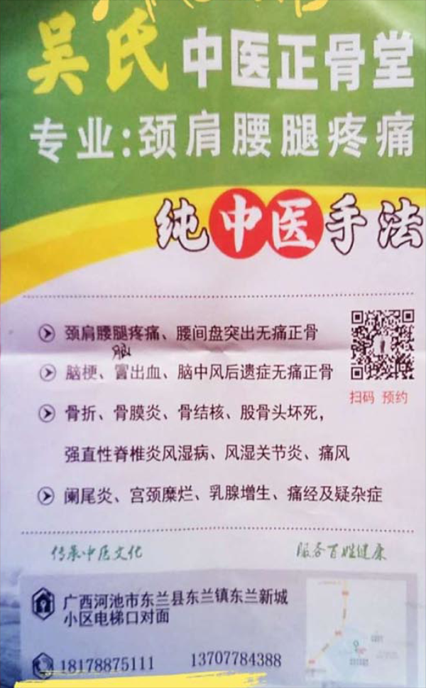 出生日期:1965年7月18日籍贯:广西东兰县主要成就:1.颈肩腰疼痛、腰间盘突出无痛正骨。2.脑梗、脑出血、中风后遗症、心肌梗塞。3.骨折、骨髓炎、骨结核、股骨头坏死。4.阑尾炎、宫颈糜烂、乳腺增生、痛经及疑杂症。