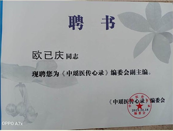 欧已庆、男1949年1月生、广西平乐县青龙乡大刚村人,系青龙大刚村卫生所乡村医生。1969年毕业于平乐县卫生学校,1974年到恭城县首届少数民族医生班学习中草药,1970年任大刚赤脚医生,曾于1994年一2000年先后参加过平乐县中医、草医、西医函授班乡村医生培训班,1994年获平乐县乡村医生证书,2009年被聘为广西《瑶药真传》编委,2011年3 月荣获中华医学临床研究特色专科专家称号,论文《浅谈中、草、西三结合治疗96例类风湿性关节炎的临床体会》2012年3月荣获广西首批乡村医生名中医称号。2001年被评为桂林市优秀乡村医生,2013年被聘为广西《瑶药真传》副主编,载于《广西民族医药协会》本人热爱医药事业,善贤好学,求贤。能用中西医方法治疗农村常见病多发病,专于中医内科,尤对中风后遗症防治有所探索,用中医辩证治疗一些疑难杂症,顽症和老年性疾病,特别是类风湿,恶性肿瘤颇有疗效。本人勤学古训,博采众长,师古不泥古,以自配"驱风利湿活血方""六藤饮用"治疗类风湿有独特的疗效。