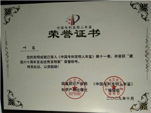 2009年因四个笫一的发明成就被录入中国专利发明人年鉴笫十一卷,并荣获六十周年百名优秀发明家荣誉称号。