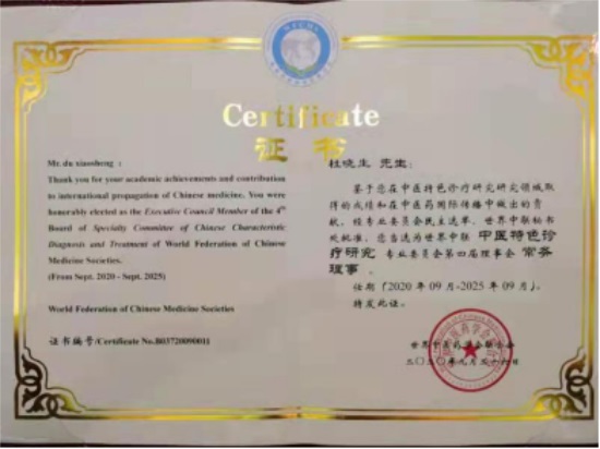2012年被世界中医学会特色专业委员会聘为理事。
