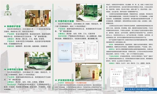 公司品牌:杜博士三圣草护发、养发、生发液是国家科研专利产品。公司有培训基地、生产加工基地、药材种植基地,从而确保服务质量、产品质量和产品疗效,无可置疑的占据毛发行业制高点。除护发、生发、养发产品夕卜,还应市场需求,开发了煥颜修护套装、中药成分的面膜、眼膜,深受三圣草品牌用户的喜欢。